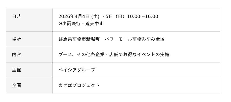 株式会社ベイシア(本社:群馬県前橋市、代表取締役社長:相木孝仁)は、4月4日(土)・5日(日)の2日間、群馬県前橋市新堀町にある「パワーモール前橋みなみ」全域にて、ベイシアグループ主催の「第2回 前橋みなみ パワーモールフェス」を開催いたします。本イベントでは、モール内各店舗によるお得な企画のほか、多彩なブースの出店やクラフトマーケットの開催など、2日間にわたる大規模な催しです。地域とモールが一体となって盛り上げる2日間、ぜひご来場ください。
