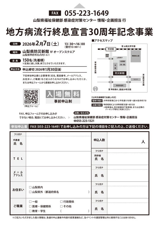 山梨県は、地方病(日本住血吸虫症)流行終息宣言から30周年を記念し、感染症対策の歴史をたどるシンポジウムを令和8年2月7日(土)、山梨県防災新館(山梨県甲府市)で開催します。約100年にわたり地域を苦しめた病の克服の歩みを振り返り、そこから得られた教訓を、これからの感染症対策にどう生かしていくかを、参加者の皆さまとともに考える機会として、専門家による講演とパネルディスカッションを行います。