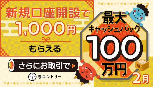2月に新しく口座開設いただいたお客さまを対象に、2026年3月13日(金)16時00分までにキャンペーンエントリーからお申込みでもれなく1,000円をキャッシュバック、さらに期間中のお取引数量に応じて、最大100万円をキャッシュバックいたします。