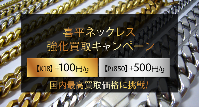 一昨年の9月に始まった喜平ネックレス買取キャンペーンですが、この度3回目を迎えることができました。これもひとえにゴールドプラザをご利用頂いたお客様のおかげです。この場を借りて御礼申し上げます。前回はおよそ1.7kgの喜平製品をお買取させて頂きました。今年は2.0kgの買取量を目指すと共に利益還元として同キャンペーンを再実施致します。