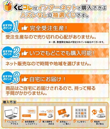 『くじコレ』はインターネットで購入できるハズレなしの抽選くじサービスです。各アイテムがすべて受注生産なので売り切れの心配はありません。(※)