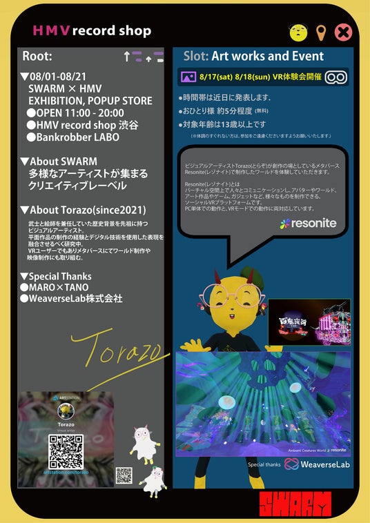このたび、「Bankrobber LABO」の企画展として、2024年8月1日(木)~2024年8月21日(水)の期間、SWARM labelによるポップアップストア "SWARM × HMV EXIBITION, POPUP STORE"を開催いたします。