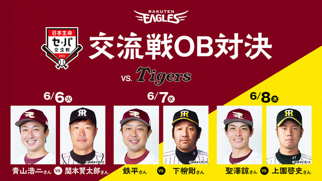 株式会社楽天野球団(本社:宮城県仙台市宮城野区、代表取締役社長:米田 陽介)は、5月30日(火)からスタートする『日本生命セ・パ交流戦2023』において、5月30日(火)~6月1日(木)横浜DeNAベイスターズ戦3試合と、6月6日(火)~8日(木)阪神タイガース戦3試合で、試合開始前に両チームのOBが参加するOB対決を行うこととなりましたので、お知らせいたします。
