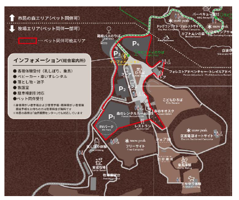 赤枠のエリアが、ペット同伴解禁エリアとなります。店舗内への同伴については、店舗により異なりますのでご確認ください。