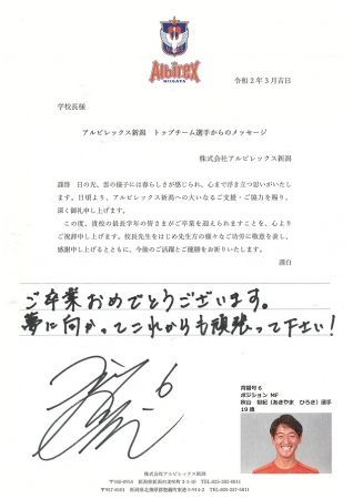 当クラブでは、ホームタウンである新潟県内の30市町村に所在する全小中学校、特別支援学校などに、卒業のお祝いでトップチーム選手よりサイン入りの直筆メッセージを贈呈しますので、お知らせいたします。