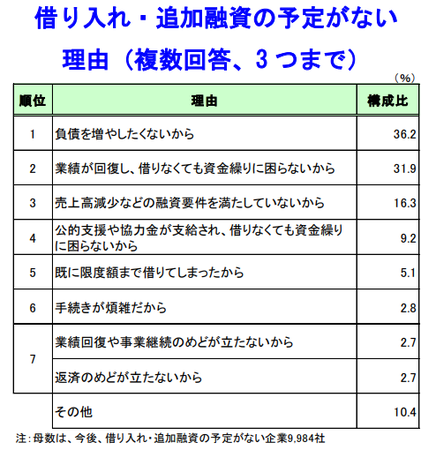 今後、借り入れ・追加融資の予定がない理由としては、「負債を増やしたくないから」(36.2%)と「業績が回復し、借りなくても資金繰りに困らないから」(31.9%)が3割台で高かった。以下、「売上高減少などの融資要件を満たしていないから」(16.3%)が2桁台で続いた