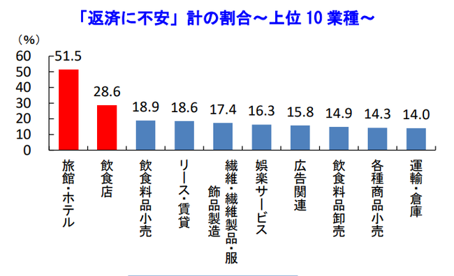 とりわけ、コロナ関連融資の返済に不安感を抱く企業では、新型コロナによる影響を大きく受けた「旅館・ホテル」が51.5%と半数を超えたほか、「飲食店」も28.6%と約3割となった。