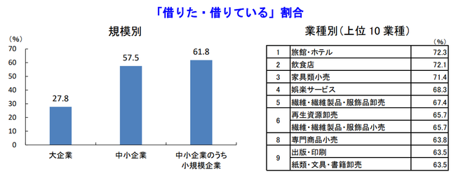と、新型コロナウイルスの感染拡大の影響を大きく受けた「旅館・ホテル」は72.3%が借りていた。さらに「飲食店」も72.1%に達している。コロナ関連融資が苦しい時期を乗り越える一助になっていた可能性が現れている。