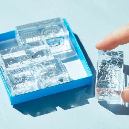 全てのパーツが透明で作られたスタンプ。上から印面が見えるので、細かく位置を調整して狙ったところにピッタリ捺せ、繊細なデコレーションも思いのままです。インクの付き具合がわかりやく、複数インクのアレンジもしやすく掠れにも気がつきやすくなっています。