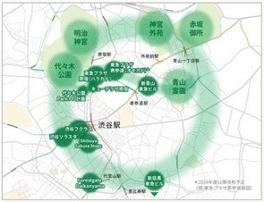 東急不動産ホールディングスでは全社方針として環境経営を掲げており、2023年には国内における不動産業初のTNFDレポート(第1版)の策定・公開、ネイチャーポジティブ化へ向けたガイドライン制定等を行なってきました。広域渋谷圏を生物多様性への取り組みの重点エリアと設定し「広域渋谷圏エコロジカルネットワークの形成(右図)」にも努め、同地域の主要施設における、植生調査・生きもの調査等も継続的に実施しています。都心における再開発事業においても「都市のネイチャーポジティブ化」に積極的に取り組んでいます。