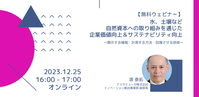 アスタミューゼ株式会社(本社:東京都千代田区、代表取締役社長 永井歩)は、2023年12月25日(月)16:00-17:00に、業界を問わず、サステナビリティに関する業務を担当している方、興味をお持ちの方を対象とした無料ウェビナー「水、土壌など自然資本への取り組みを通じた企業価値向上&サステナビリティ向上 ~開示する情報・計測する方法・回復させる技術~」を開催いたします。