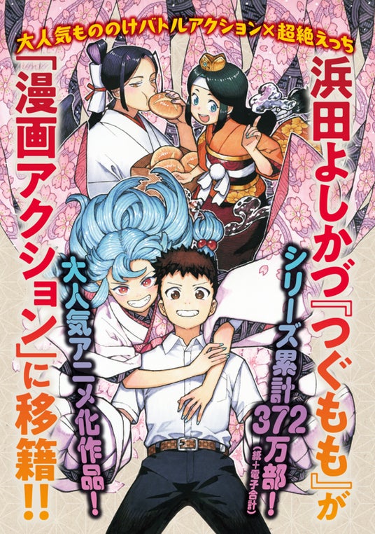 『つぐもも』の「漫画アクション」移籍を記念して、浜田よしかづイラスト色紙プレゼント企画も実施します。『つぐもも』32巻と「漫画アクション」4/2号(3月19日発売)についている応募券、計2枚が必要になります。詳細は (https://fr.futabasha.co.jp/tsugumomo/present/) をご覧ください。