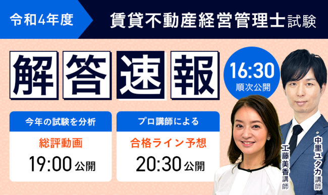 アガルートアカデミーは、2022年(令和4年)賃貸不動産経営管理士試験の「解答速報」「総評動画」「合格ライン・合格点予想動画」を会員登録不要で無料公開いたします。ぜひ、試験の振り返りにお役立てくださいませ。