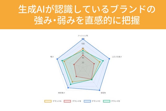 本機能により、こうした生成AI上の評価構造をレーダーチャートなどで可視化、ブランドの強みと弱みを把握することで、AI検索最適化を行う際の強化すべき軸と、そうでない軸を見極めた戦略構築が可能となりました。