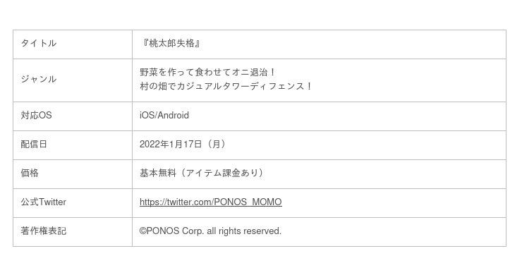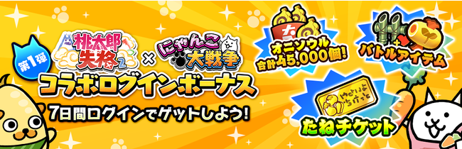 ポノス株式会社(本社:京都府京都市、代表取締役:辻子依旦、以下「ポノス」)はスマートフォン(iOS/Android)向けゲームアプリ『桃太郎失格』におきまして、『にゃんこ大戦争』コラボイベントの開催が決定しました。対象期間には、コラボ限定ガチャおよび限定ベジ丸が手に入るイベントを開催いたします。また本日4/10(月)より、ベジ丸たちをゲットできるイベント「豊作ウィーク」を開催いたしましたので、これをお知らせいたします。