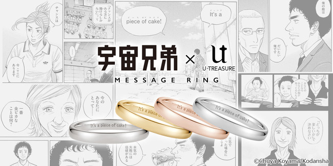 大人のための本格的なキャラクタージュエリーを扱うユートレジャー(東京都豊島区:代表取締役:伊藤 崇史)は、『宇宙兄弟』の作中に登場する印象的なメッセージを内側に刻んだリング(指輪)を、8月26日(金)に発売します。このたびの新作は、シンプルなストレートラインの指輪に、「My greatest enemy is really myself.(俺の敵は だいたい俺です)」など、背中を押してくれる『宇宙兄弟』のメッセージを、6種類から選んで刻むことができます。メッセージをいれた指輪の内側には、丸みを持たせて着け心地を良くする内甲丸仕様を施しています。シルバー、K18イエローゴールド、K18ピンクゴールド、プラチナ950の4素材の展開です。ユートレジャーコンセプトストア池袋、ユートレジャーオンラインショップにて取り扱います。