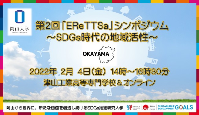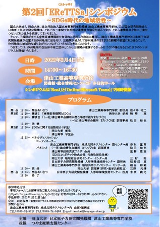 つきましては、作州地域の自治体や商工団体とこれら三機関が連携するきっかけづくりの場となるように以下の第2回「EReTTSa」シンポジウム~SDGs時代の地域活性~を2022年2月4日(金)に現地とオンラインの併用で開催いたします。
