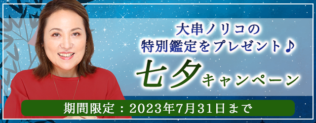 『七夕キャンペーン』では、七夕の夜に1年に1度だけの「再会」という願いを叶える織姫と彦星のように、あなたの願いが叶うよう…大串ノリコの特別鑑定をご用意致しました。対象鑑定を1つ占っていただくごとに、特別鑑定を1つプレゼント!ぜひ、この機会に大串ノリコの占いをお楽しみください。