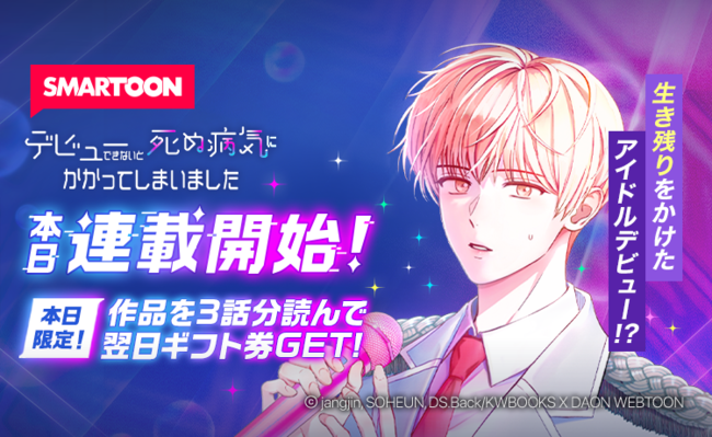 この度ピッコマでは、満を持して日本連載をスタートいたします。日本においては、ピッコマ独占配信作品として「待てば¥0」で読むことができます。また、ピッコマでは「デビューできないと死ぬ病気にかかってしまいました」の新連載を記念して、現在特設ページと、アイドルデビューさながらの作品PVを公開中。作品の世界観を盛り上げる公式Twitter(@piccoma_jp)上でのイベントや、作品をお得に読むことができるキャンペーンも合わせて実施しております。詳細は、下記特設ページよりご確認いただけます。