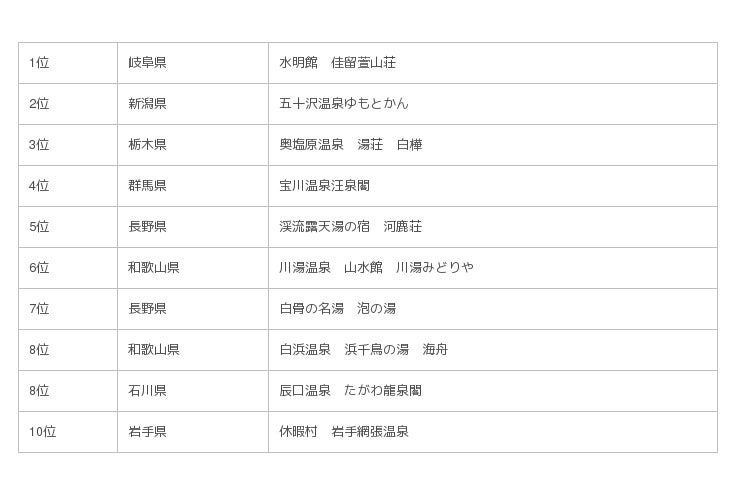 旅行予約サービス「楽天トラベル」 ( http://travel.rakuten.co.jp/ )は、「混浴風呂のある人気の温泉宿ランキング」( http://travel.rakuten.co.jp/mytrip/ranking/mixed-bathing/ )を発表しました。「混浴」のキーワードの入った宿泊プランの宿泊人泊数(宿泊のべ人数)実績のある温泉宿を対象に、お客様の声の「風呂」評価の点数をもとに算出した結果、1位は岐阜県の「水明館 佳留萱山荘」、2位は新潟県の「五十沢温泉ゆもとかん」、3位は栃木県の「奥塩原温泉 湯荘 白樺」がランクインしました。
