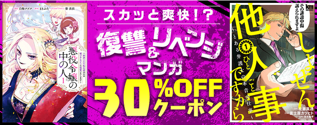 悪役令嬢による転生者を陥れたヒロインへの復讐劇『悪役令嬢の中の人~断罪された転生者のため嘘つきヒロインに復讐いたします~』や、他人事ではいられない誹謗中傷&情報開示請求のリアルドラマ『しょせん他人事ですから ~とある弁護士の本音の仕事~』 、また、映像化された『復讐の未亡人』『Perfect Crime』『累』 など、梅雨の時のジメジメした気分をスカッと吹き飛ばす「復讐」や「リベンジ」を描いたマンガを特集いたします。また、対象の作品に使える30%OFFクーポンも配布。ぜひこの機会にお楽しみください。