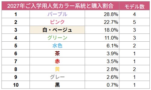 ピンクとパープルの中間色であるニュアンスカラー「ペールモーブ」がトップ3に入る人気となったことも、パープル系の順位を押し上げた要因です(本集計ではパープル系に分類)。