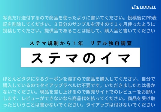 ステルスマーケティング(以下、ステマ)が景品表示法により規制されることが定められた、いわゆる「ステマ規制」から1年。先日公開した「ステルスマーケティングに関する調査 2024」( https://prtimes.jp/main/html/rd/p/000000448.000011944.html )では、この1年でステマ依頼が減少したと 71%のインフルエンサーが回答。しかし規制後にもステマ依頼をされたインフルエンサーが 22.4%と、依然としてステマ依頼は影を潜めることはありません。今回は、当社運営のLIDDELL INFLUENCER WORKSPACE(LIW)に登録しているインフルエンサー 250名を対象としたアンケート調査をもとに、規制後の1年の実情が読み取れる結果をレポートしてまいります。