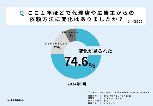 この1年で代理店や広告主からの依頼方法に変化があったと感じるインフルエンサーが 74.6%