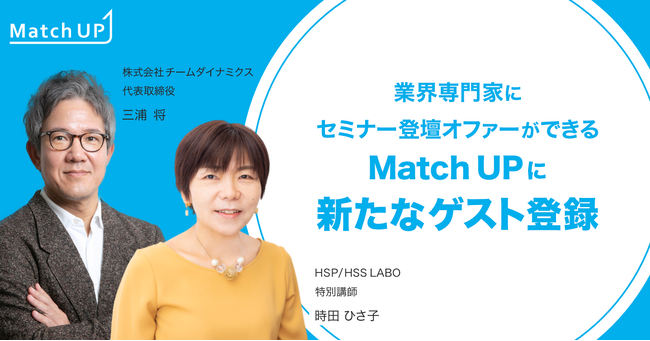 株式会社イノベーション(東証グロース 証券コード3970)のグループ会社である、株式会社Innovation X Solutions(本社:東京都渋谷区、代表取締役社長:遠藤俊一、以下「Innovation X Solutions」)は、業界専門家に企業が主催するセミナー/イベントへの登壇オファーができるマッチングサイト「Match UP」に、株式会社チームダイナミクス 代表取締役 三浦 将氏、HSP/HSS LABO 特別講師 時田 ひさ子氏など、豪華専門家が新たにゲスト登録されたことをお知らせします。