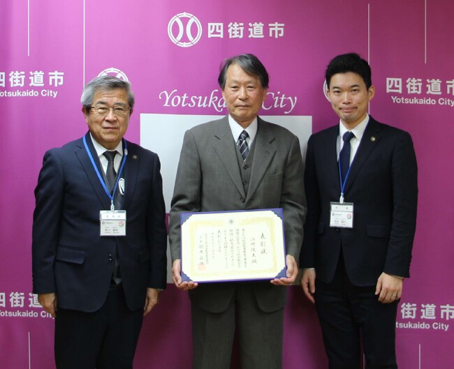 令和5年11月9日に宮崎県で行われた第65回全国社会教育研究大会において、社会教育の振興発展に尽力した功績をたたえられ、令和5年度全国社会教育委員連合表彰を受賞された江崎俊夫さんが、四街道市長を表敬訪問しました。