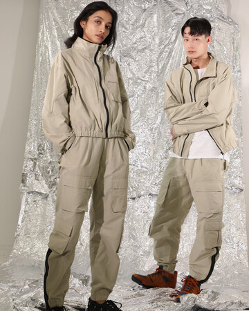 各所に配置されたカーゴポケットや裾ジップのデザインが立体感を演出。