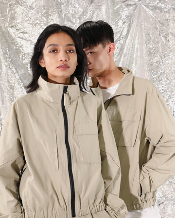 リップストップ生地のナイロンジャケットは、袖のパイピングや裾丈でヴィンテージスポーツジャケットのデザインを踏襲しつつ、各所に配置した大きめのカーゴポケットやダミーポケットで再構築。