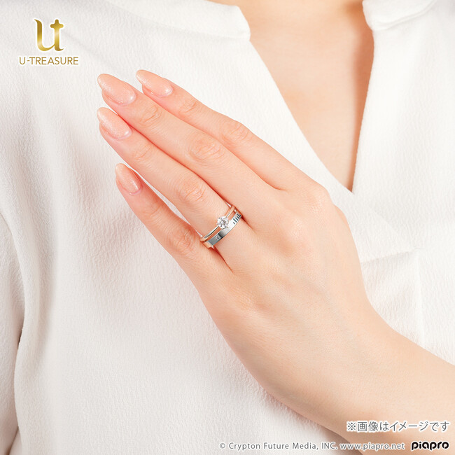 シンプルで上品な佇まいのソリティアリング。センターストーンの輝きを最大限に引き立たせる立て爪タイプを採用。石座には初音ミクの横顔シルエットとイメージカラーのエメラルドを留めています。おふたりの新たな人生が幸せで満ち溢れますように…。