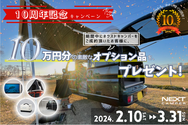 株式会社ブレイズ(愛知県名古屋市、代表取締役:市川秀幸、以下ブレイズ)は、2024年2月10日(土)~3月31日(日)の期間、軽キャンピングカーキット「NEXT CAMPER(ネクストキャンパー)」をご契約いただいたお客様に、お好きなオプション10万円分をプレゼントする「10周年記念キャンペーン」を実施いたします。