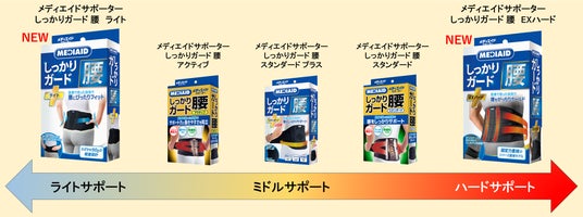 その中で、「デスクワークや家事など、日常生活でも気軽に装着できてフィットする製品が欲しい」、「仕事上、腰を酷使するので、固定力は高く、装着時のズレ上がりとムレを軽減した製品があると助かる」といったお声を頂いており、そのご要望にお応えすべく、この度、「メディエイドサポーター しっかりガード 腰」シリーズへ、新たに「ライト」、「EXハード」の2製品をラインアップする運びとなりました。