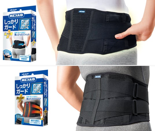 ▲新たに発売するメディエイドサポーター しっかりガード 腰 ライト(上)、EXハード(下)