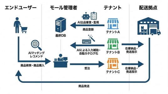 - AIマッチングレコメンド: 買い手(ユーザー)の行動履歴と、売り手(テナント)の商品・サービス特性をAIが分析し、最適なマッチングを実現。