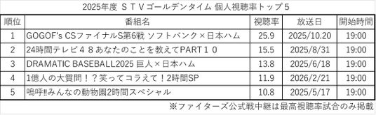 ゴールデンでは2025年10月20に放送した「CSファイナルステージ第6戦 ソフトバンク×日本ハム」で個人視聴率導入後の最高視聴率となる25.9%などファイターズ戦中継6試合で10%以上の視聴率を獲得、レギュラー番組では土曜日に放送している「嗚呼!!みんなの動物園」が8.1%、「1億人の大質問!?笑ってコラえて!」が7.4%の年度平均視聴率が牽引しました。(平均視聴率には2時間以上のスペシャル版を含む)
