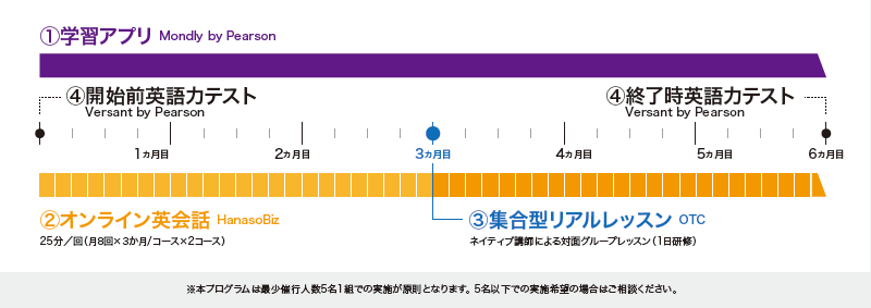 1.アプリ学習と2.オンライン英会話を6か月間継続し、中間時に3.リアルレッスン(1日集中)を受講していただきます。開始前および終了時には、4.英語力テストを通じて効果を測定し、日常的なビジネス英語に対応できるスキル習得を目指します。