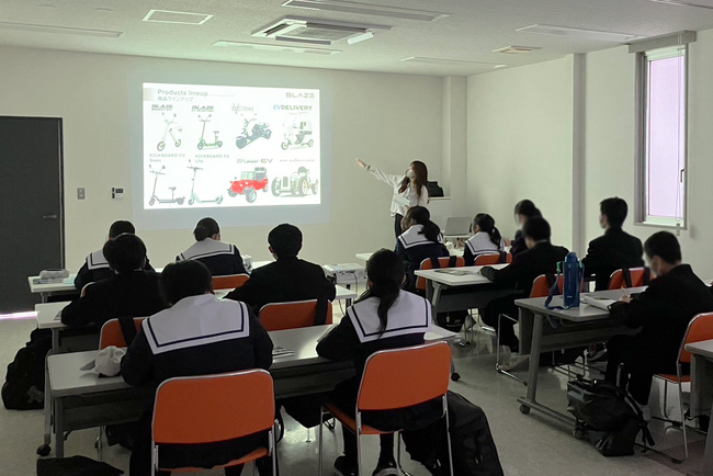 弊社の事業概要、ならびにSDGsへの取り組みなどについての講義を実施するとともに、ブレイズの提唱する新ブランドコンセプト「LIFE EV」(*下記参照) の下に展開する電動モビリティの全商品、ならびに軽キャンピングカーキット「ネクストキャンパー」にも、実際に触れていただきました。