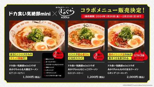 また登録者数29万人、背徳飯テロ系動画で話題のYouTubeチャンネル『miniのドカ食い気絶部チャンネル』共同監修のもと、人気ラーメン店「じゃぐら高円寺」店主が研究・試作を繰り返して完成した至極のコラボラーメン3種が期間限定で販売されます。にんにくも背徳感もたっぷりな限定メニューを合わせてお楽しみください。