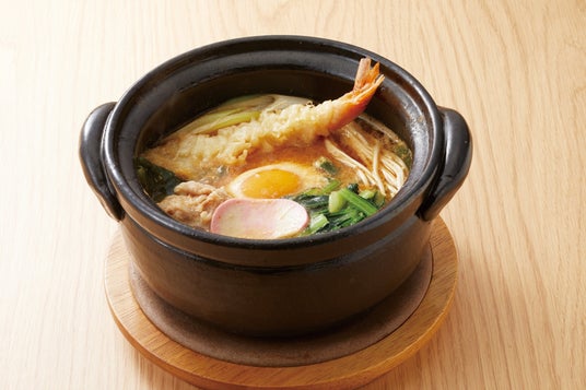 得得味噌鍋うどん 1,160円(税込)濃厚でコク深い味噌だしが心と体を包み込む「得得味噌鍋うどん」。ぷりっとした海老天もトッピングされ、贅沢感たっぷりの人気メニューです。