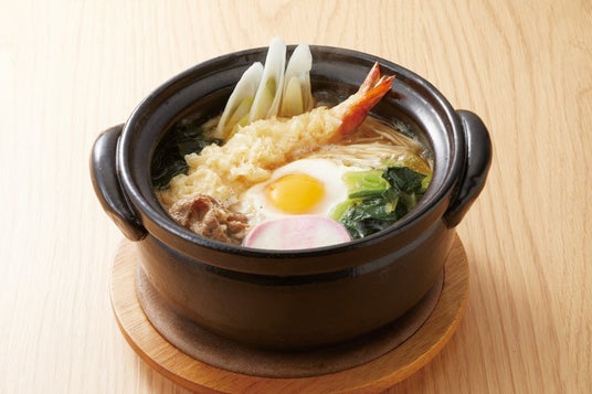 鍋焼きうどん 1,160円(税込)湯気が立ち上る関西風かつおだしに、海老天、牛肉、玉子、白ネギをのせた王道の「鍋焼きうどん」。この季節にぴったりの一品です。