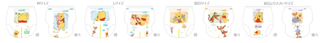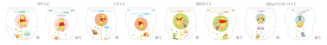 ・おむつ柄:各サイズ2種(「プーさんと森の仲間たち」と「お茶目なプーさん」)のデザイン。