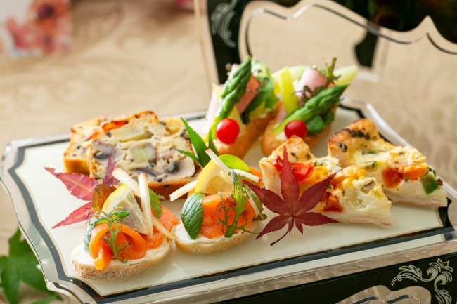 【セイボリープレート】さつまいもと黒ごまのケイクサレ/彩り野菜のキッシュ/パストラミとじゃがいものエクレア・サレ/スモークサーモンとクリームチーズ/リンゴのオープンサンド