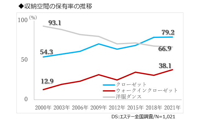 家庭におけるウォークインクローゼットの保有率は12.9%だった2000年以降、2021年には38.1%と20年間で約3倍に増加しています。