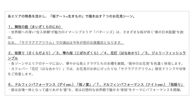 日本の春を代表する“お花見文化”に水族館ならではの要素を加え、当館はこれまでも「デジタルアートの桜×海の世界」が織りなす、桜エンターテインメントを展開してまいりました。当館の春の風物詩ともいえる「サクラアクアリウム」は、今年新たにイマーシブエリア「パターンズ」の演出がお披露目となり、より美しく、没入感あふれるお花見体験をお届けします。