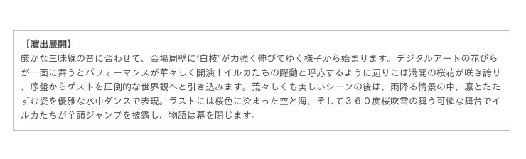 前半は、桜が力強く芽吹く様子や桜花の可憐さ、穏やかさなどをイルカたちのスピード感あふれるパフォーマンス・水中ダンスで表現し、“魅せる”演出で会場を盛りあげます。