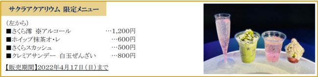 こちらでは発光サンゴや円柱水槽を眺めながら、「サクラアクアリウム」の限定メニューがお楽しみいただけます。