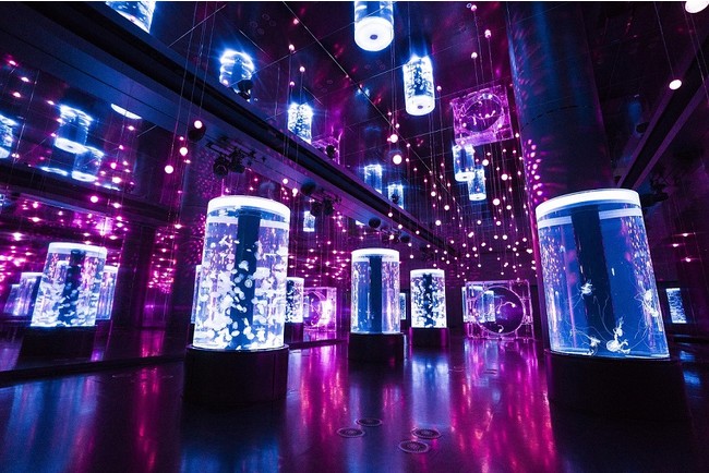 音と光の演出でクラゲたちの魅力を引き立てる、幅約9m×奥行約35mにもおよぶ展示ゾーン。フロアには7つの円柱水槽と全面がクリスタルのシンボリックな水槽が並び、ミズクラゲやインドネシアシーネットルなどがご覧いただけます。